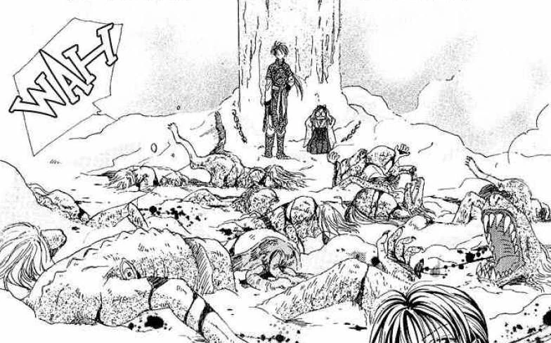 Because of the demonic presence on the mountain, a nearby village adopted a tradition to chain criminals to the pillars and wait until they would either succumb to the cold or to the houkyou. The Celestial Warrior, Uruki, is initially sentenced to die on the peak. He is barely kept alive by his celestial powers before Takiko appears and saves him.[2]