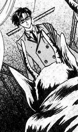 Suddenly, Sasaki appears. He anxiously asks Miaka for his glasses but his repeated requests grow more violent as blood begins dripping from the side of his head. He pushes Miaka against the railing before throwing her over the side. As she falls, she is transported back inside the Universe of the Four Gods.[2]